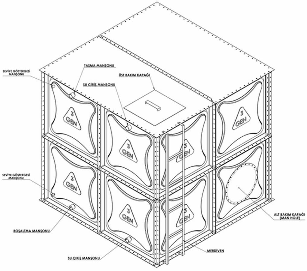 Modüler depolar yüksek kapasiteli preslerde soğuk sıvama yöntemiyle üretilir. Preslerde üretilen bu parçalar gerekli düzeltmeleri ve temizlikleri yapılarak yine özel olarak hazırlanmış delik açan preslerde yan yüzeylerine delikler açılarak üretim aşaması bitirilir. Üretilen depo parçaları civata, conta ve diğer sarf malzemeleri eklenerek özel ölçülerde hazırlanmış paletler üzerinde ambalajlanır ve sevk edilecek duruma getirilir. Ambalajlanması tamamlanan ürünler siz değerli müşterilerimizin verdiği sevk adreslerine sevk edilerek montaj öncesi aşaması tamamlanır. Deponun kurulacağı alana sevk edilen depolar yönlendirilen montaj ekiplerimiz tarafından montajları tamamlanarak su testi yapmaya hazır hale getirilir. Montajı tamamlanan depolar mümkün olması ve su sağlanması durumunda doldurularak ve su testi yapılarak siz değerli müşterilerimize su testinin yapıldığına dair formlar doldurularak teslim edilir. Montaj sonrası suyun sağlanamaması durumunda su testi müşterilerimiz tarafından yapılacaktır. Montajı yapılan ve devreye alınan modüler depolar içine koyulacak suyun niteliğine göre belirli dönemlerde boşaltılarak temizliği ve bakımı yapılır. Bu durum depo içindeki suyun daha sağlıklı olmasını sağlamakla birlikte depoların ekonomik ömrünü de uzatmaktadır.
